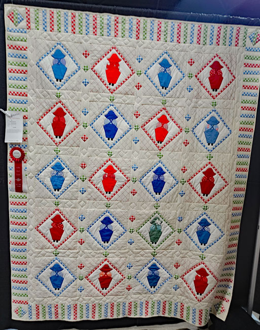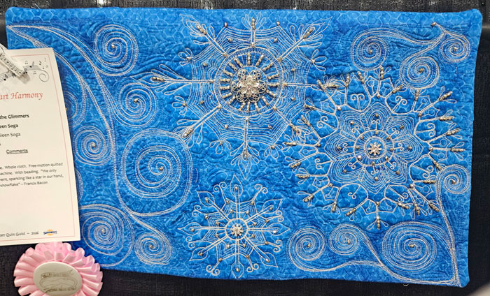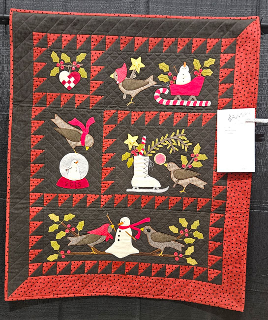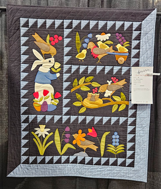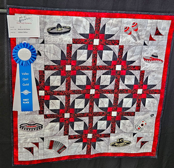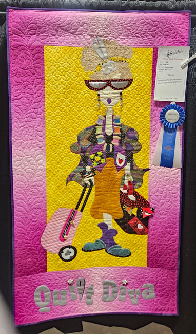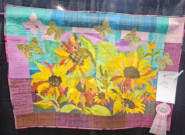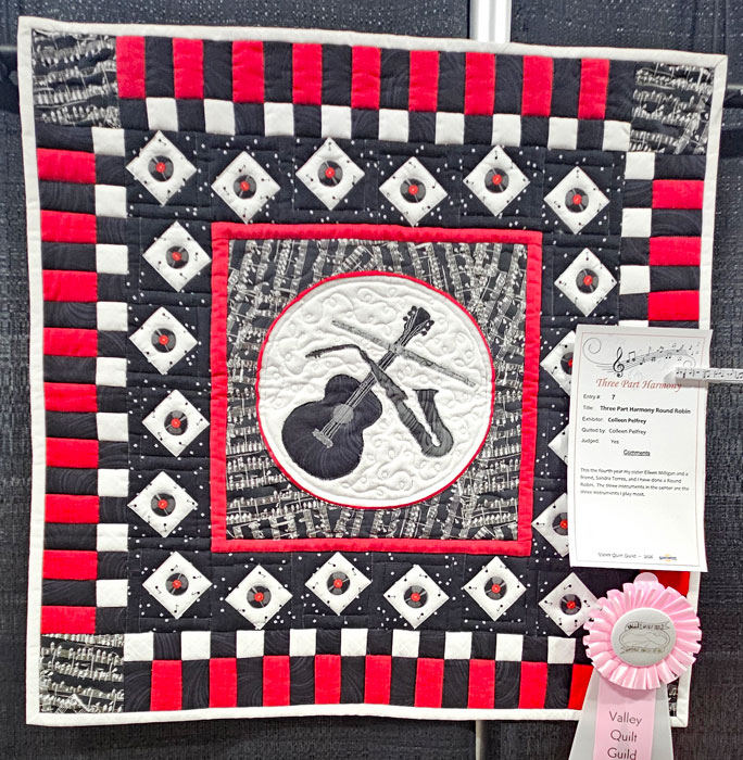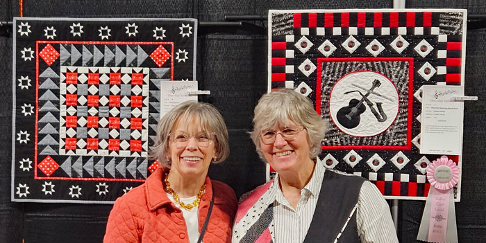 I met up with my friend, fellow teacher and next year’s Quit Show chair Colleen Pelfrey. We’re standing in front of her quilt and her sister Eileen’s quilt. Collen is a musician and entertainer; her musical quilt is on the right in the photo. Her reward for being a part of this year’s show: